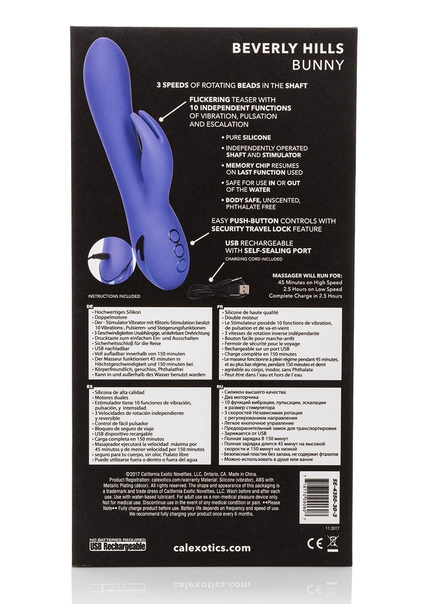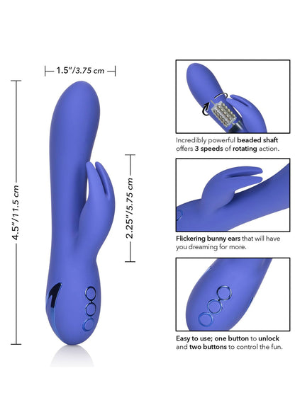 The California Dreaming Beverly Hills Bunny Vibe is a luxurious rabbit vibe with 10 intense vibration functions and a unique rabbit teaser. This rabbit vibe is waterproof, so you can also use it in the shower or bath. Charge it in just 2.5 hours with the included USB charging cable to enjoy 45 minutes of high-speed stimulation or 2.5 hours of low-speed vibration. Made of hypoallergenic, unscented silicone, the vibe is body-safe. We recommend using this product with lubricant.