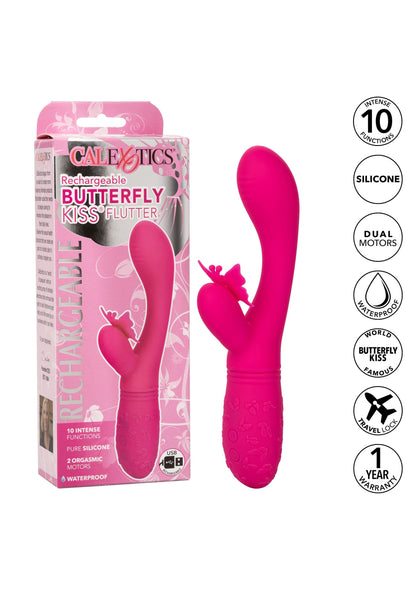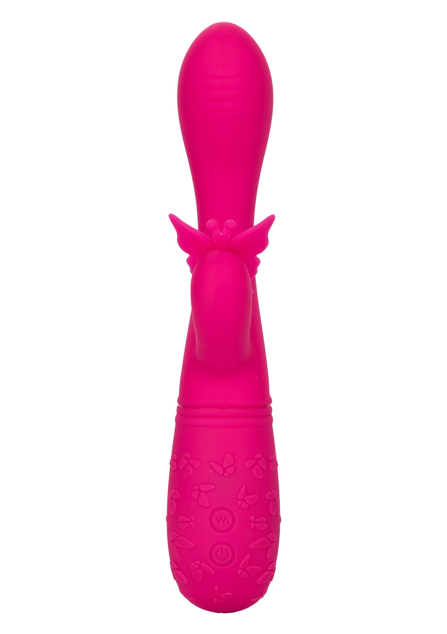 Designed for intimate pleasure, the Rechargeable Butterfly Kiss Flutter is an erotic toy box must-have for any pleasure lover. This sensually contoured massager is here to super-charge your pleasure with 10 functions of vibration, powerful dual motors, and fluttering butterfly teaser. The blushing butterfly is a perfect option for beginners and a sensual option for the erotically experienced. Indulge in 10 power-packed functions of vibration, pulsation and escalation with the push-button control. Dual high-intensity motors put out knee-shaking vibration throughout every inch of this passionate vibrator. The fluttering wings and antennae of this flexible butterfly flutter faster with every change of vibration to tickle external sweet spots. Get playful with up to 55 minutes of low speed or 40 minutes of high speed vibrations with the easy touch button control. Recharge your pleasure in only 1.25 hours with the provided USB charging cable.
