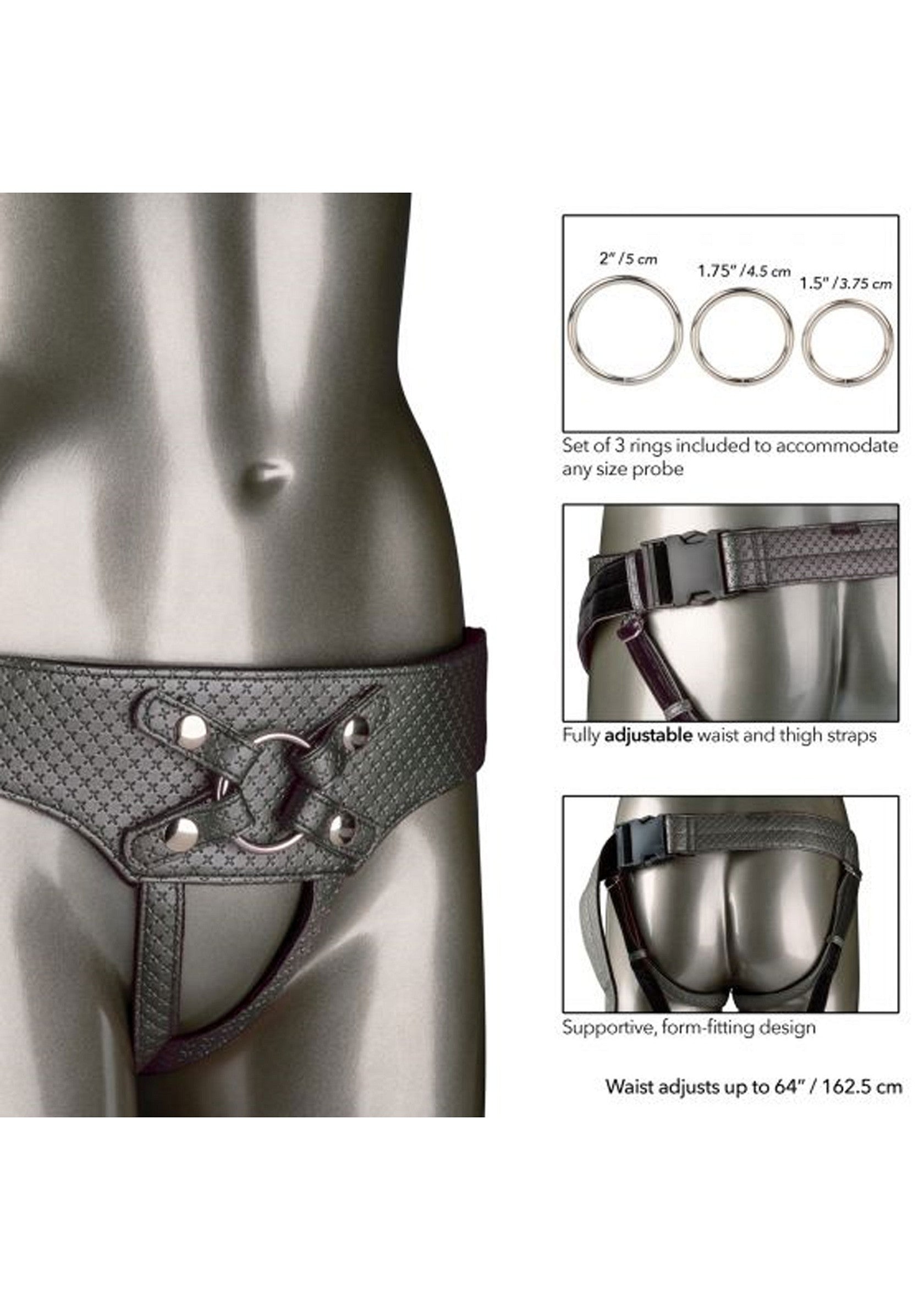 The Regal Empress is een luxe dildoharnas, waarin je je favoriete dildo of vibrator kan bevestigen. Het harnas is speciaal ontworpen voor beginnende en ervaren gebruikers die samen met een partner willen experimenten. The Regal Empress heeft een ontwerp zonder kruis en is gemaakt van dubbellaags veganistisch leer. Het harnas is volledig verstelbaar en heeft stevige dij- en taillebanden voor optimaal comfort. The Regal Empress wordt geleverd met drie O-ringen, zodat ieder formaat probe in het harnas past. De maximale tailleomvang van dit harnas is 162.5 cm.