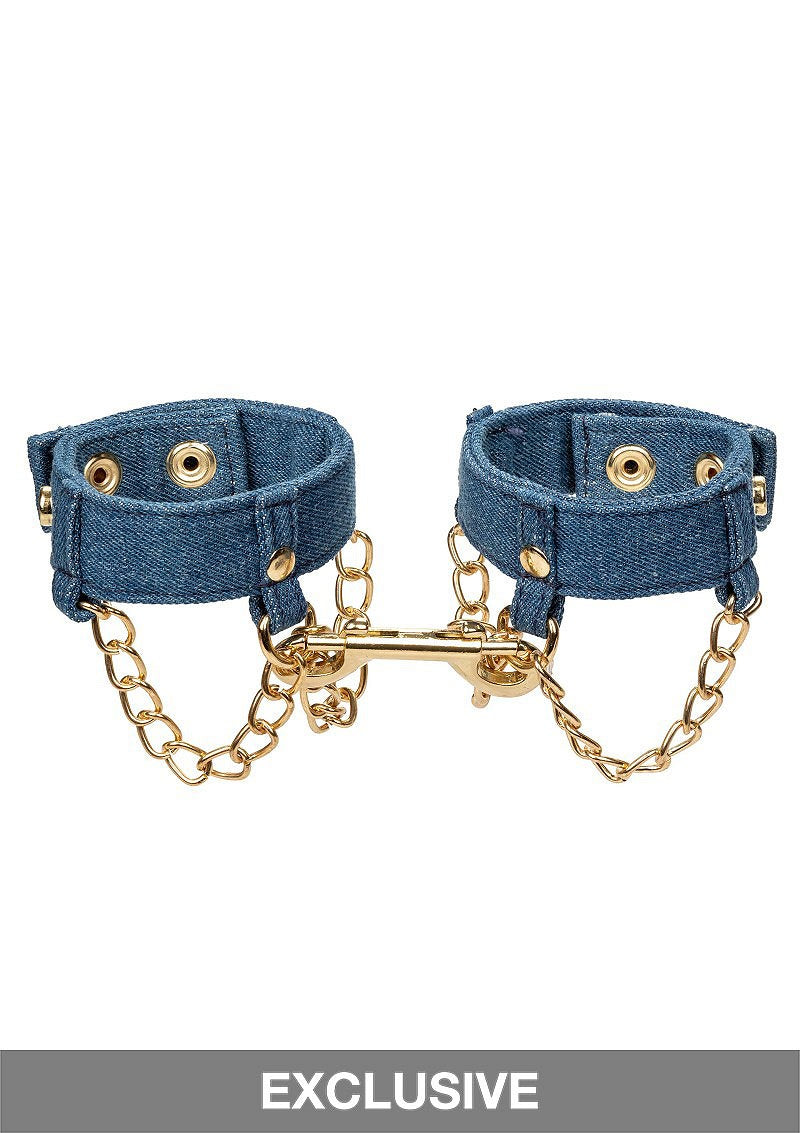 Ride 'em Premium Denim Collection Polsboeien, mixen stijl, comfort en beperking voor BDSM-avonturen. Verstelbaar met drukknopen voor een nauwsluitende pasvorm, ze beschikken over een dubbelzijdige sluiting voor veelzijdigheid en D-ringen voor verkenning. Vervaardigd van zacht, duurzaam denim met ontwerpkettingen voor sensualiteit, bieden ze zowel comfort als stijl. Perfect voor beginners en liefhebbers, nodigen deze boeien uit tot verkenning van macht dynamiek en creëren onvergetelijke momenten van plezier en overgave.