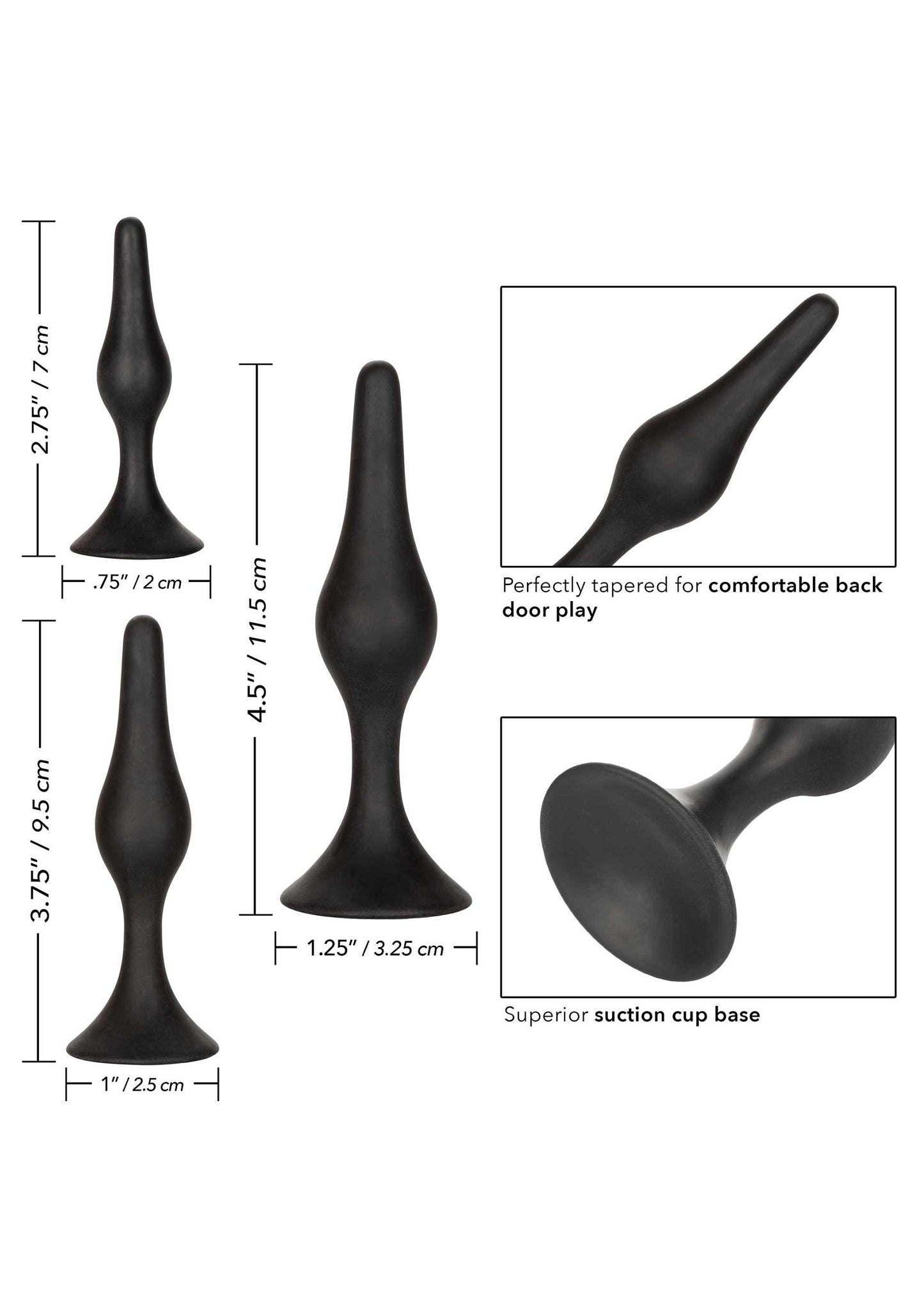 De Silicone Anal Starter Kit is een set zeer die geschikt is om je ervaring in anaal plezier op te bouwen. Deze kinky kit bevat een set van 3 anale pluggen waarmee je op een veilige en comfortabele manier anale stimulatie kunt verhogen. Elke plug in deze kit wordt geleidelijk langer en groter om het anale plezier in stappen te vergroten. De flexibele sondes zijn gemaakt van glad siliconen. Dit materiaal is ongeparfumeerd en lichaamsveilig. Wij adviseren dit artikel te gebruiken met een glijmiddel