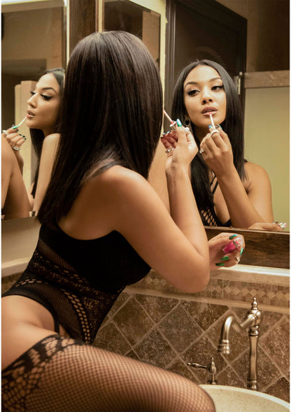 Jarretel bodystocking van multi desing net met gekruiste bandjes.