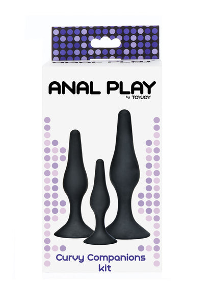 De Curvy Companions Kit van ToyJoy bevat drie verschillende buttplugs voor optimale anale avonturen. Elke buttplug heeft een andere lengte en doorsnede en is voorzien van een zuignap. De vorm is taps, met een verdikking op de helft en een vernauwing tegen de basis aan.